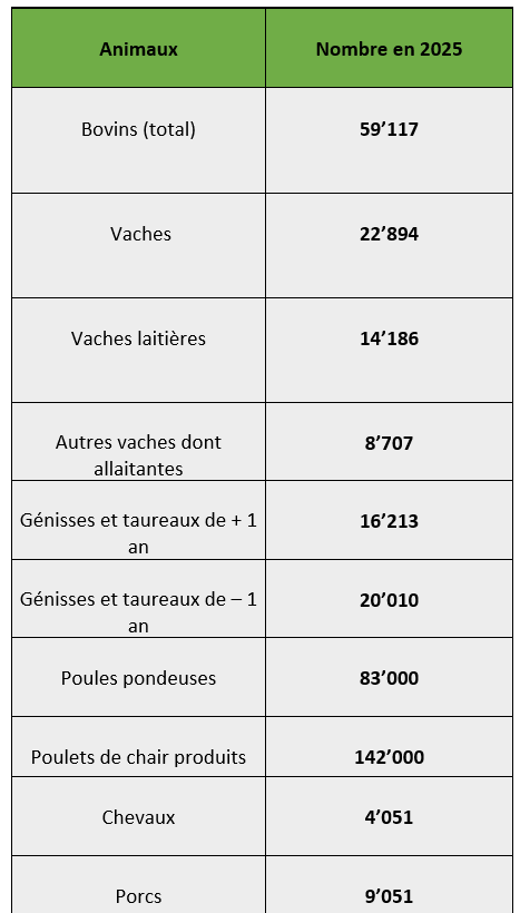 L’effectif de vaches laitières se situait en décembre 2025 à 522’004 têtes contre quelque 568’000 têtes en novembre 2016. Avec les gains de productivité, la diminution du cheptel n’a aucun effet sur les quantités produites qui restent donc stables en moyenne pluriannuelle. Elles varient d’une année à l’autre.