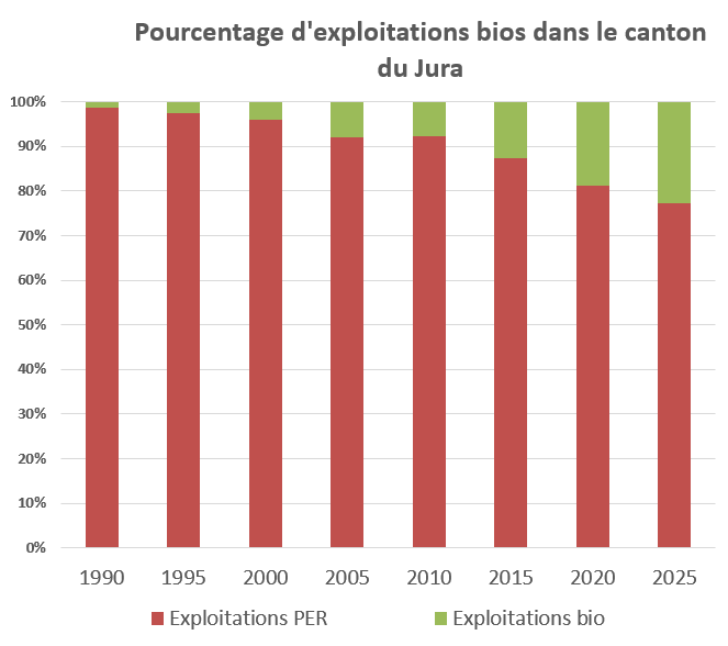 Le canton du Jura est le canton romand avec le plus haut taux de surfaces exploitées selon le cahier des charges biologiques et ce mode de production n’a cessé de poursuivre son essor depuis les années 2’000. Si 22% des agriculteurs jurassiens produisent selon les normes bio, plus de 99% respectent les prestations écologiques requises (PER), garantissant un mode de production durable et respectueux de l’environnement. En 50 ans, l’agriculture est passée d’un modèle productiviste à une approche plus multifonctionnelle et durable. Les milieux agricoles ont d’ailleurs dépassé les objectifs fixés par la Confédération en termes de mise en réseau de surfaces dédiées à la biodiversité. Dans le Jura, près de 8’000 hectares, soit 20% des surfaces agricoles, sont consacrés à la promotion de la biodiversité, alors que les exigences légales nous en imposent 7%. Nourrir la population de manière durable tout en minimisant les impacts sur l’environnement est aujourd’hui un enjeu majeur pour l’agriculture helvétique.