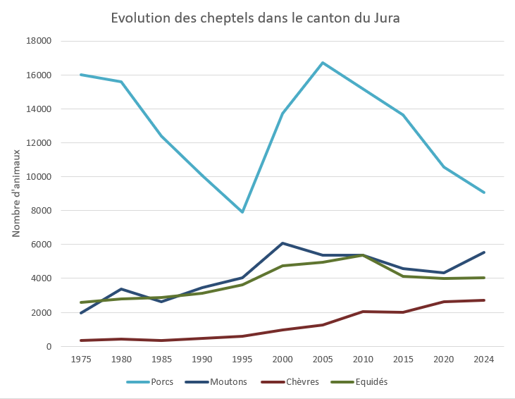 Si l’augmentation des équidés, volaille, ovins et caprins ne vient pas concurrencer le cheptel bovin, elle montre néanmoins que les producteurs sont à la recherche de solutions. En 50 ans, c’est la production porcine qui s’est le plus diminué, passant de 16’000 porcs en 1975 à environ 9’000 aujourd’hui, malgré une embellie au début des années 2’000. Parallèlement, la production de volaille est en hausse constante, reflétant les changements de consommation dans la société.