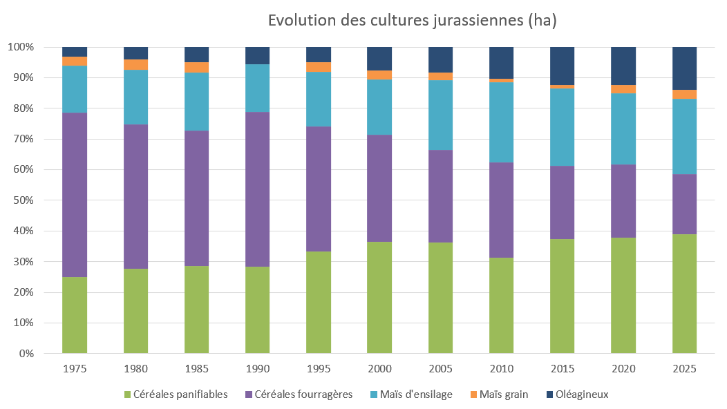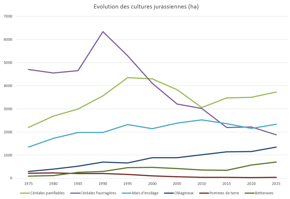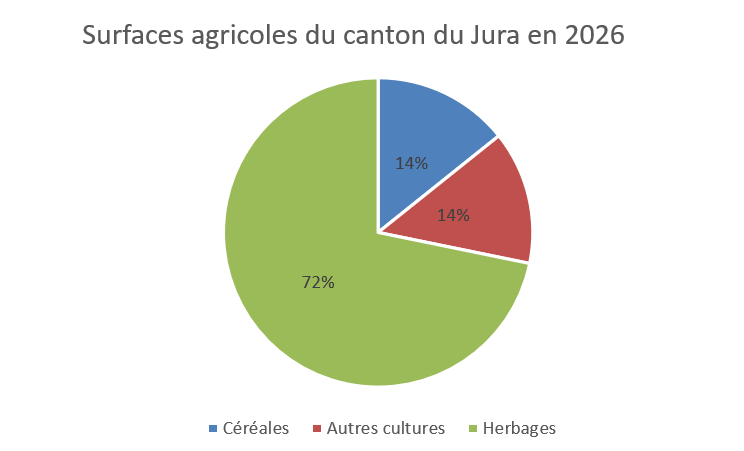 De par son climat et sa topographie, la vocation naturelle du canton du Jura est la production herbagère. La SAU jurassienne est occupée à 72% par des prairies permanentes et temporaires. Les 28% restants sont voués aux grandes cultures. Les productions aussi ont changés depuis 1975. La surface de céréales est en baisse alors que les cultures à haute valeur fourragère comme les oléagineux et les betteraves sont en augmentation constante depuis 1975. Elles sont préférées aux céréales fourragères dont la surface de production chute fortement depuis les années 1990. Ceci est certainement dû aussi à la baisse des prix qui touche le secteur céréales depuis ces années.